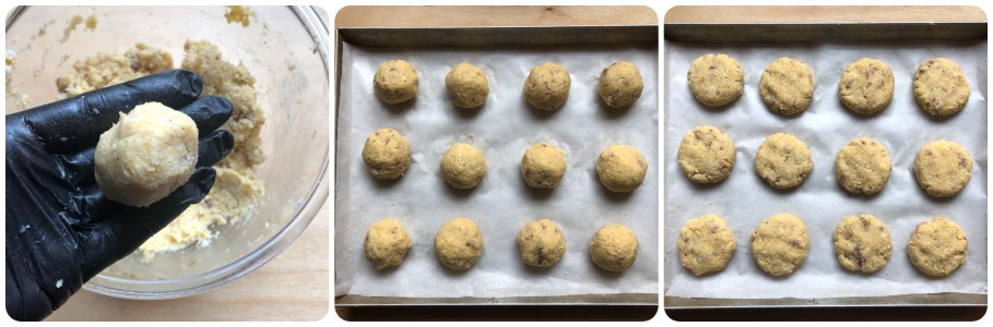 Prendre des portions d’environ 40 g, former des boules, les disposer au fur et à mesure sur la plaque recouverte de papier sulfurisé et les aplatir légèrement avec les doigts pour les rendre un peu plates. De cette façon, vous obtiendrez des boulettes toutes de la même taille qui cuiront uniformément.