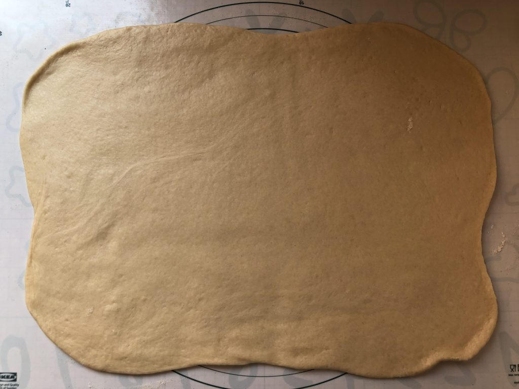 • À la fin du temps de levée, transférer la pâte sur le plan de travail légèrement fariné et l’étaler avec le rouleau à pâtisserie pour former un rectangle : le mien mesurait 45 X 35 cm.