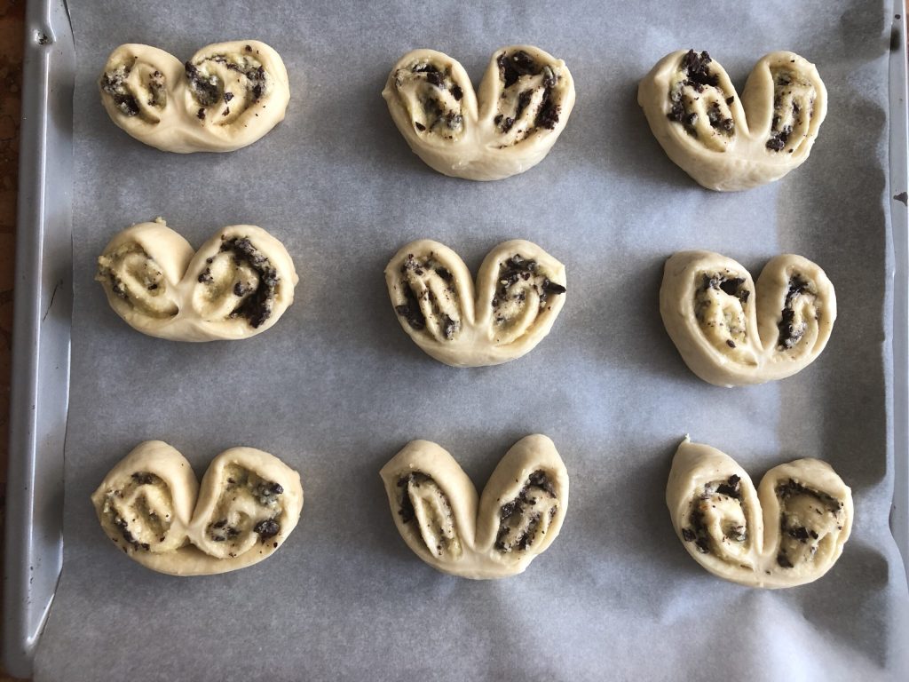 • Couper le double rouleau obtenu en tranches de 2,5/3 cm d’épaisseur environ. Prendre chaque morceau et le plier vers le haut pour former une sorte d’éventail.