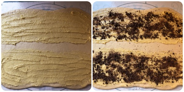 • Maintenant, étaler la crème d’amandes sur la pâte en laissant une bande libre au centre, puis distribuer le chocolat en éclats sur la crème.