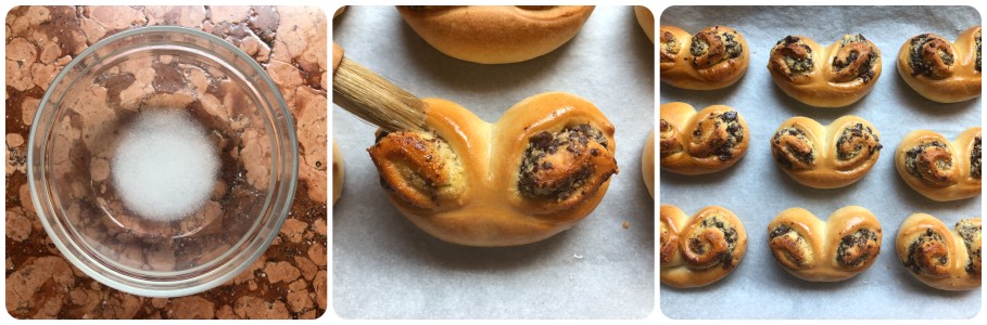 • Mélanger 20 ml d’eau avec 20 g de sucre et porter le mélange à ébullition (j’ai utilisé le micro-ondes) pour que le sucre se dissolve parfaitement. Ensuite, sortir les brioches aux amandes du four et les badigeonner immédiatement pour les faire briller. Avant de les déguster, saupoudrer de sucre glace. Profitez-en! Paola