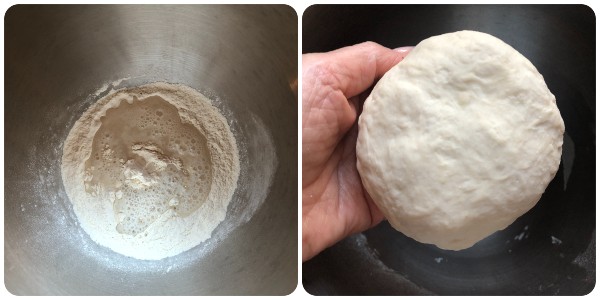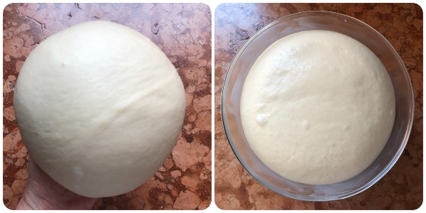 • Former une boule, la transférer dans un grand bol légèrement graissé avec du beurre, couvrir et laisser lever jusqu’à ce que le volume double dans un endroit tiède et à l’abri des courants d’air. Le temps dépend beaucoup de la température de votre environnement et peut aller de 2 à 4 heures.