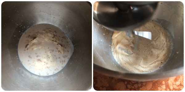 • Ensuite, verser ce mélange sur le pré-pâte dans le bol du robot pâtissier et donner un rapide coup de fouet.