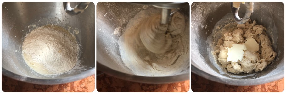 • Ensuite, ajouter l’eau tiède et travailler longuement avec le fouet à crochet. On obtiendra une pâte très ferme et non lisse. Vous aurez sûrement la tentation d’ajouter plus d’eau mais NE LE FAITES PAS!