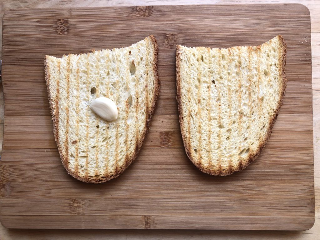 Lorsque le pain est grillé, on peut le frotter à volonté avec une gousse d’ail : cela dépend bien sûr de votre goût personnel.