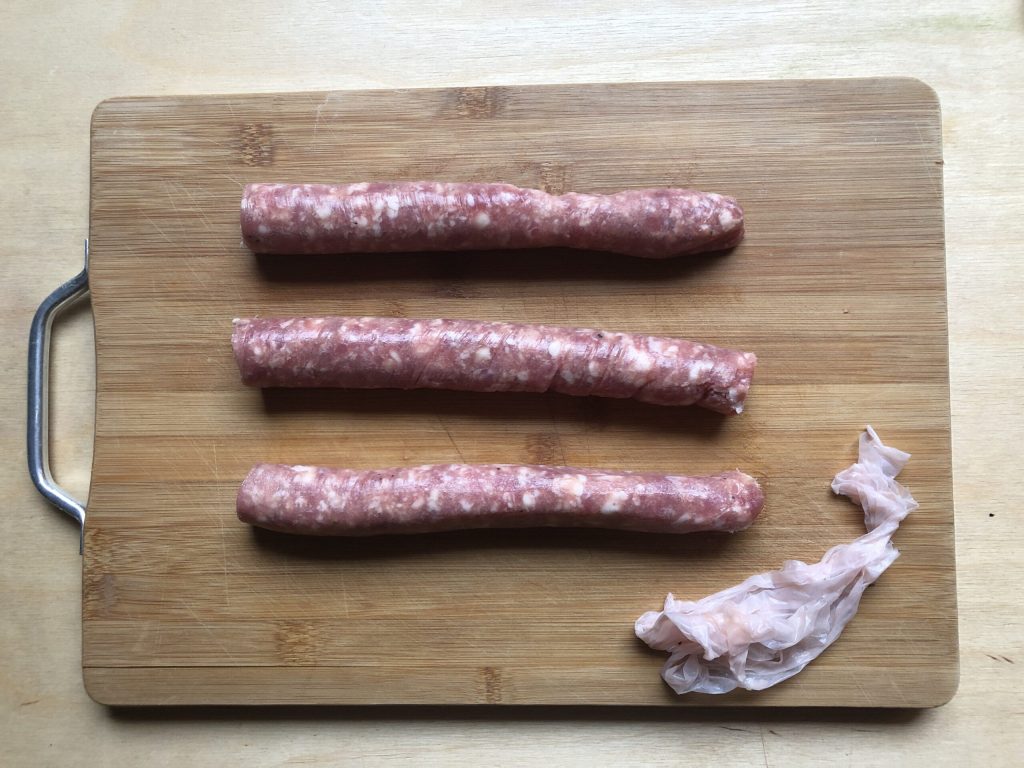 • Couper la luganega en 3 morceaux de 20 cm de long et les dénuder de leur boyau: je vous conseille d’utiliser des ciseaux pour éviter de casser la saucisse.