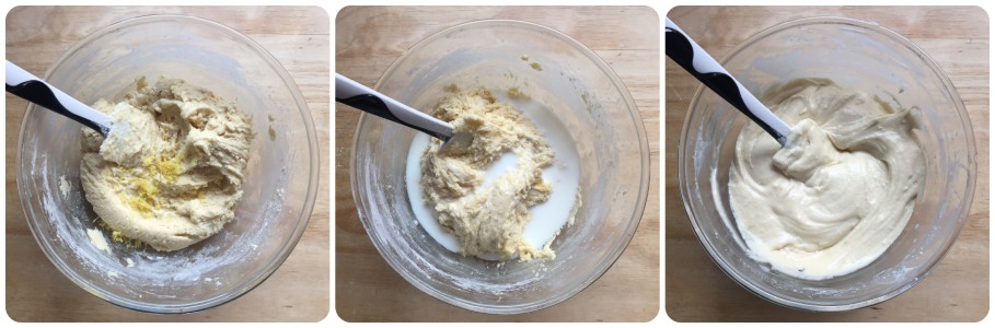 Lorsque les ingrédients secs sont incorporés au mélange, ajouter le zeste d’un demi-citron (non traité, bien sûr!) puis le lait et bien mélanger le tout.