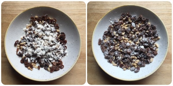 Égoutter les raisins secs, les presser, les tamponner avec du papier absorbant et les mélanger avec les pignons. Ensuite, les fariner légèrement pour éviter qu’ils ne tombent au fond du gâteau pendant la cuisson.