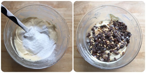 Ajouter maintenant à la pâte du cake la levure tamisée puis le mélange de raisins secs et pignons.