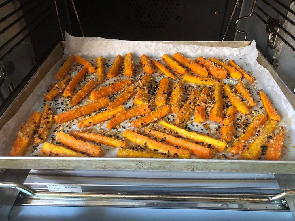 Aujourd’hui, je vous montre une façon de rendre extrêmement appétissantes et invitantes de simples carottes. Je suis certaine que même les enfants mangeront volontiers ces carottes gratinées au four. Les graines de sésame noir confèrent à l’ensemble cette touche qui plaît beaucoup aux yeux. Cependant, si vous ne les trouvez pas (même si elles sont désormais présentes dans presque tous les supermarchés) vous pouvez les remplacer par du sésame blanc plus commun. Je vous assure qu’il sera difficile de les mettre à table, surtout si quelqu’un traîne dans la cuisine lorsque vous les sortez du four. C’est ce qui s’est passé chez moi. Juste le temps de prendre des photos et mon fils Lorenzo les a pratiquement fait disparaître, ne laissant que quelques petits morceaux tristes dans le plat. Puis il s’est justifié en me disant textuellement : « tu devrais être contente ; cela signifie qu’elles étaient vraiment bonnes ». Bon… la prochaine fois que je les ferai, j’augmenterai les quantités.