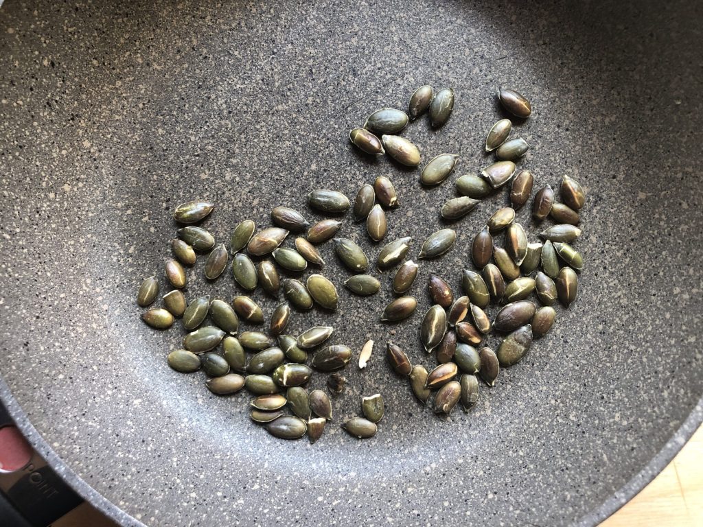 • Chauffez bien une petite poêle sans huile et faites griller les graines de courge pendant 2/3 minutes. Vous entendrez un léger craquement. Ce sera le son qui vous indiquera qu’elles sont prêtes.
