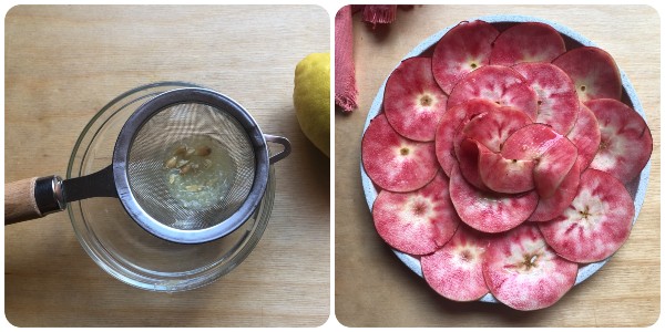 • Lavez les pommes, séchez-les et coupez-les en fines tranches avec une mandoline. Comme vous pouvez le voir, ces pommes sont rouges à l’intérieur et sont d’une saveur incroyable. Je n’ai pas enlevé le trognon central mais seulement les pépins.