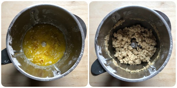 • Mettre dans le bol les aiguilles de romarin avec 50 g de farine prélevée du total et hacher (15 sec. vitesse 8). Si vous n’avez pas le Bimby, utilisez un hachoir.