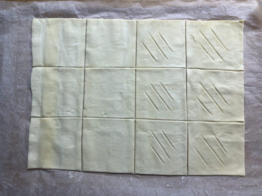 Transférez le tout au réfrigérateur pendant une quinzaine de minutes pour que la pâte feuilletée se refroidisse et que les carrés ne perdent pas leur forme lorsque nous devrons les déplacer.