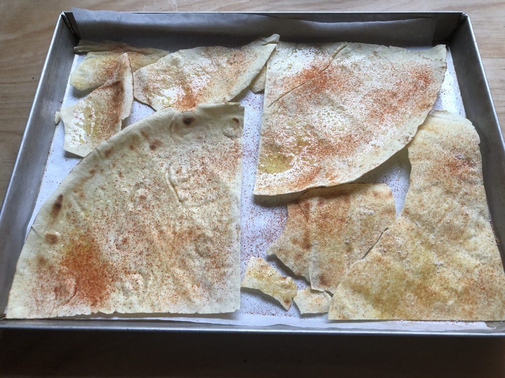 Disposer les feuilles de pain carasau sur une plaque recouverte de papier sulfurisé sans les superposer et les badigeonner d’huile.