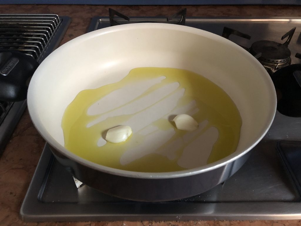 Dans une casserole, chauffez quelques cuillères à soupe d’huile et faites-y revenir une gousse d’ail épluchée, coupée en deux et privée de son germe central.