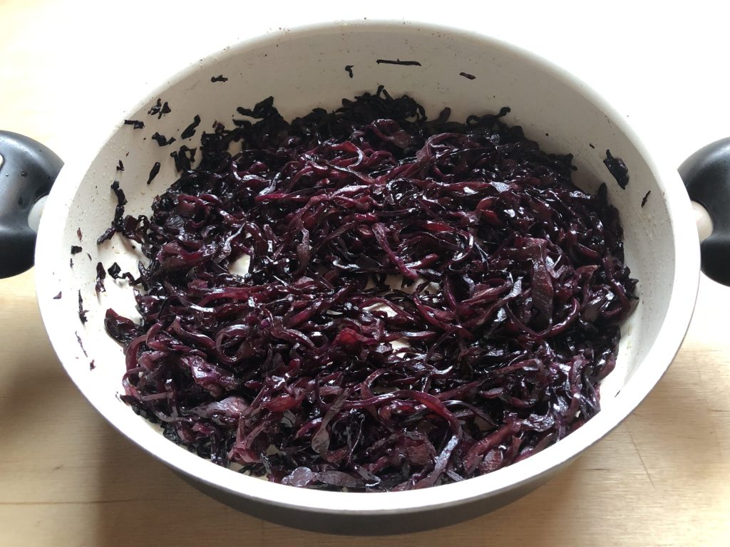 Enlevez l’ail et servez le chou rouge aigre-doux tiède ou même froid. Enjoy! Paola.