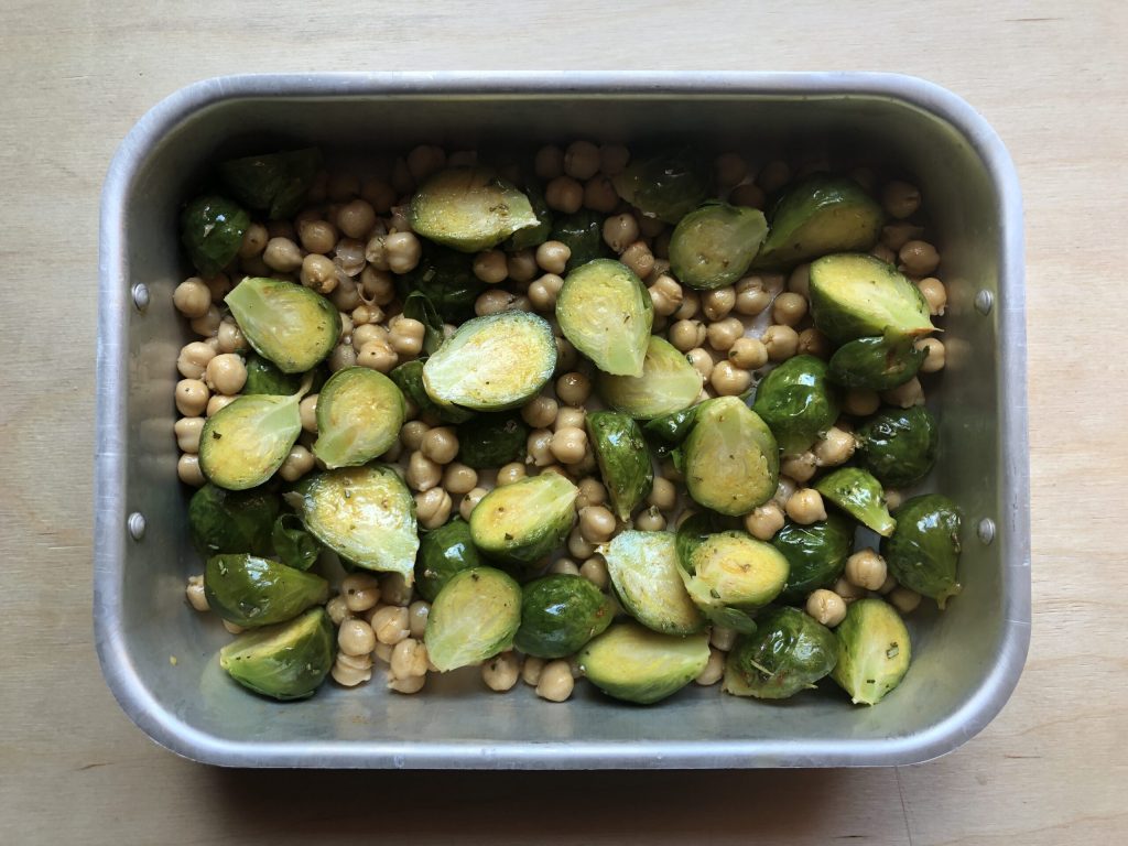Préparation des choux de Bruxelles et pois chiches rôtis