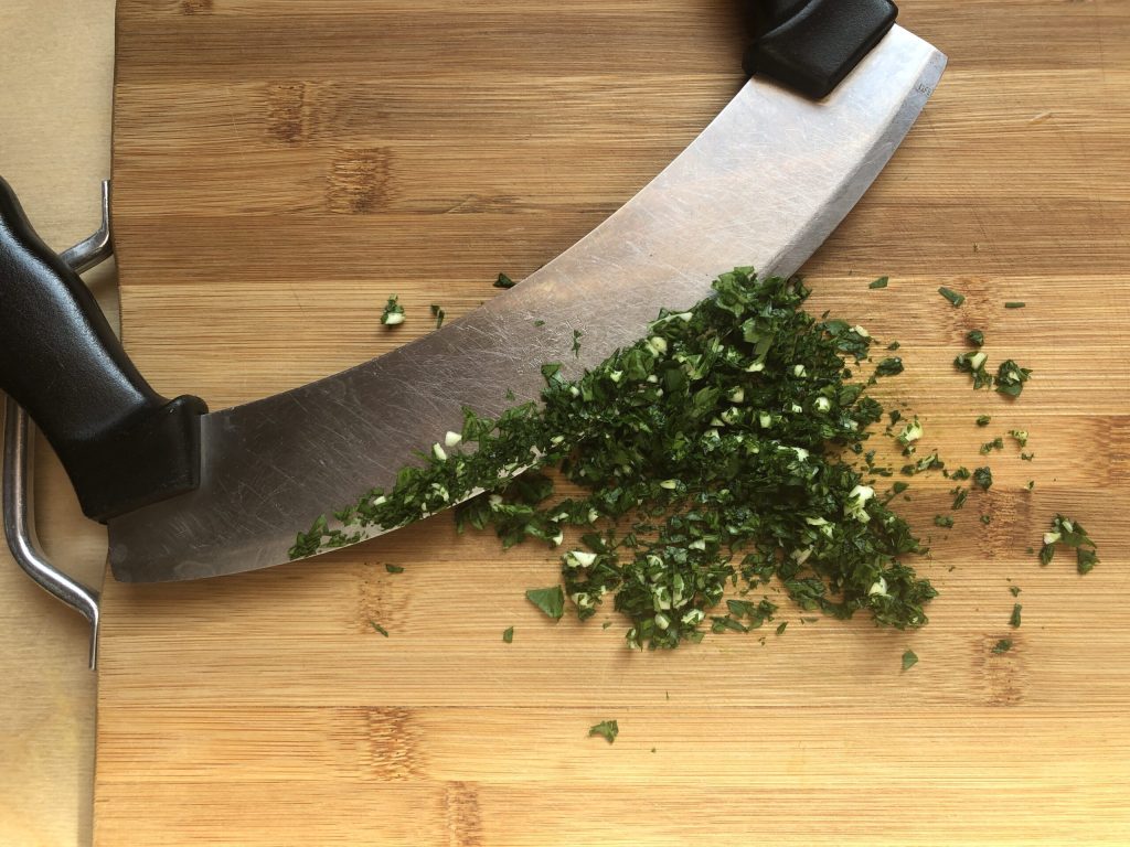 • Peler la gousse d’ail, retirer le germe central et hacher finement avec le persil.