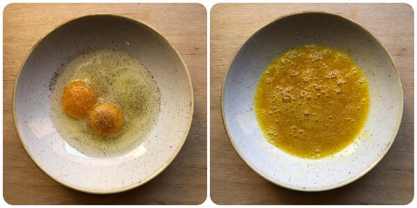 Entre-temps, casser les œufs dans un bol, ajouter une bonne pincée de sel, une généreuse mouture de poivre noir et les battre avec une fourchette le temps nécessaire pour amalgamer jaunes et blancs.