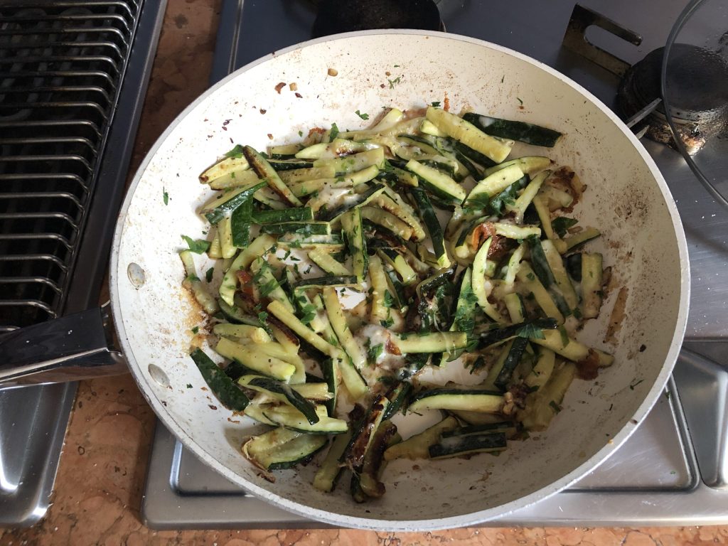 Quand les courgettes sont tendres mais encore croquantes, ajoutez la scamorza et le fromage râpé. Couvrez pour bien faire fondre les fromages.