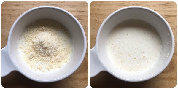 • Verser la crème dans une petite assiette, ajouter 20 g de fromage râpé et mélanger avec une fourchette.