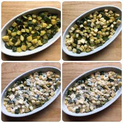 • Lorsque les courgettes sont prêtes, les transférer dans un plat allant au four légèrement beurré ; ajouter les dés de fromage et verser dessus le mélange à la crème. Enfin, saupoudrer la surface avec le fromage râpé restant. (10g).