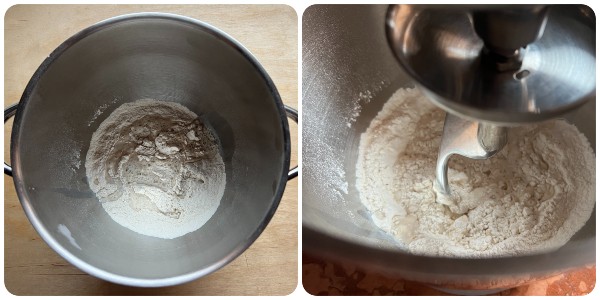• Mettre dans le bol du robot pâtissier les deux farines avec la levure sèche et le sucre, puis mélanger avec un petit fouet manuel.
