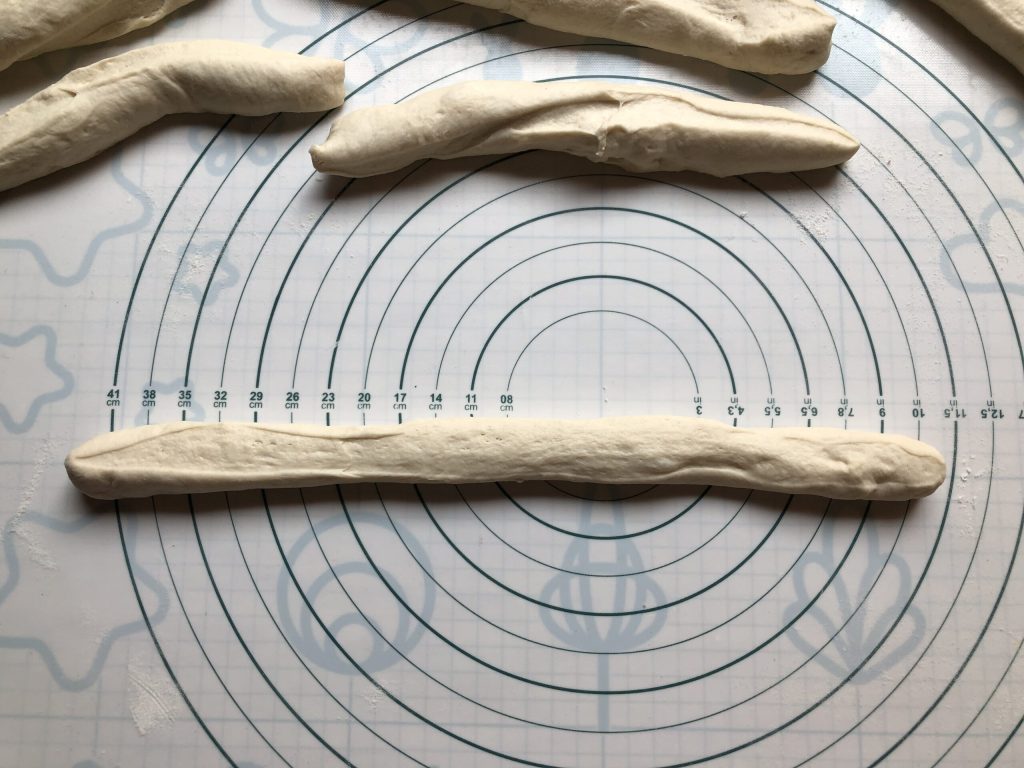 • Une fois cette première levée terminée, déposer la pâte sur le plan de travail et la diviser en huit parts aussi égales que possible.