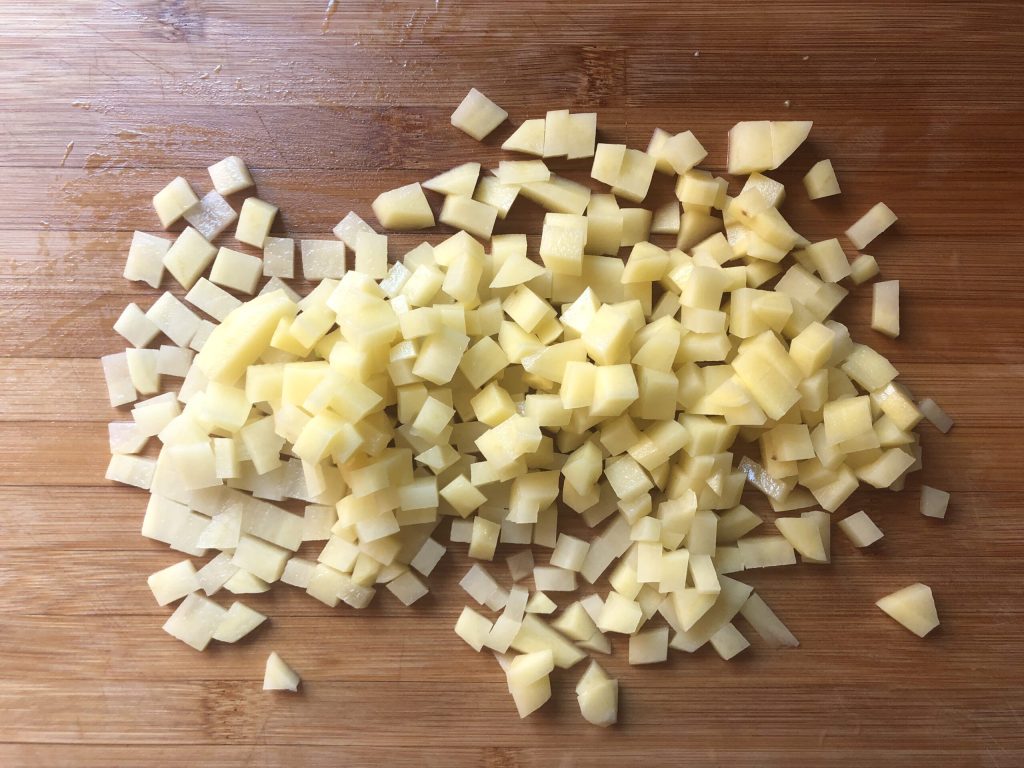 Peler les pommes de terre, les laver et les couper également en morceaux.
