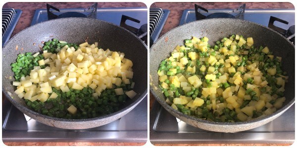 Ensuite, ajouter également les pommes de terre et quelques autres cuillères d’eau et continuer la cuisson pendant encore une dizaine de minutes. Si les légumes deviennent trop secs, ajoutez un peu plus d’eau.