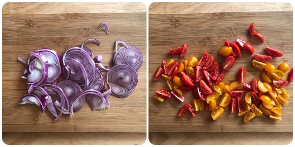 Dans cette recette, j’ai utilisé des tomates cerises rouges et jaunes. Si vous ne trouvez pas ces dernières, vous pouvez facilement utiliser uniquement des tomates cerises rouges.
