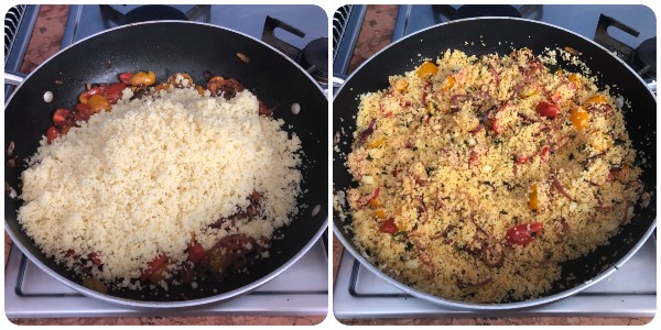 Pendant ce temps, réhydrater le couscous en suivant les instructions sur le paquet. J’ai mis 250 ml d’eau dans une autre casserole, je l’ai salée, j’ai ajouté une cuillère à soupe d’huile et je l’ai portée à ébullition. Puis j’ai versé le couscous et éteint le feu. Je l’ai laissé absorber l’eau pendant environ 3/4 minutes, en le détachant avec une cuillère en bois ou une fourchette. Ensuite, j’ai ajouté une noix de beurre, j’ai rallumé le feu et terminé la cuisson à feu très doux pendant encore 3/4 minutes en remuant de temps en temps.