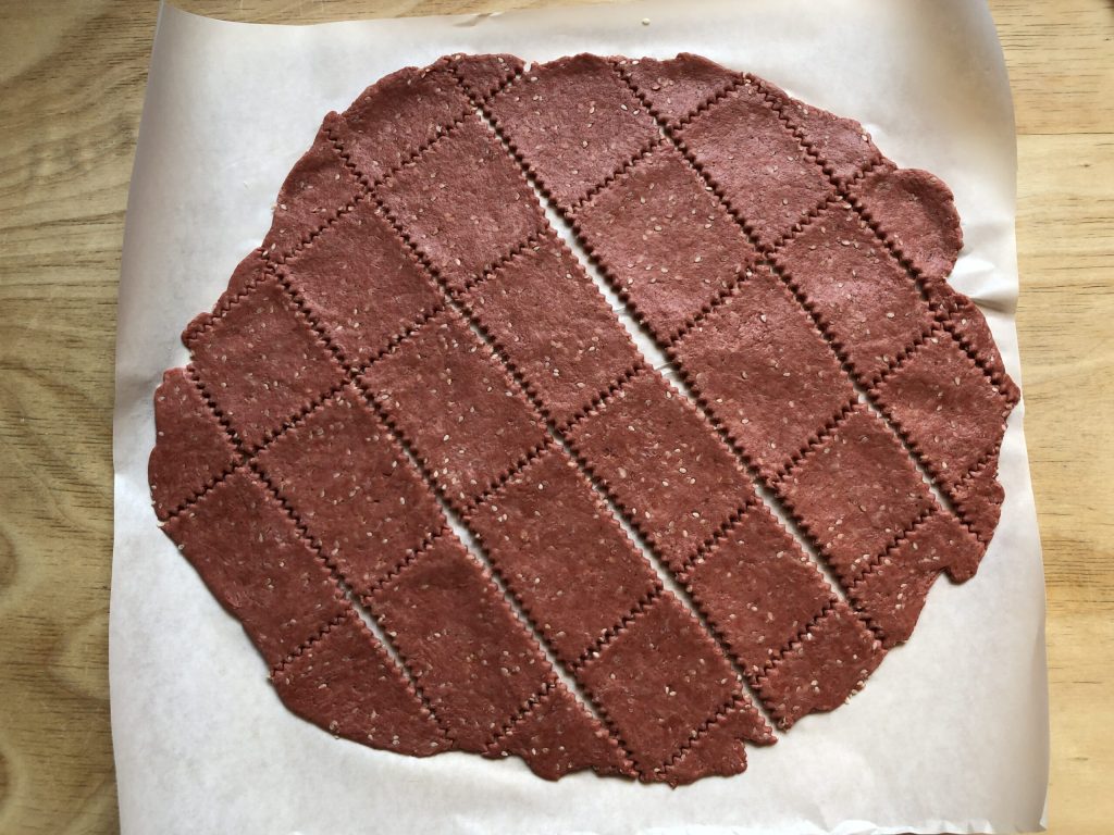 J’ai réalisé la pâte de ces crackers roses avec le Thermomix, mais n’importe quel autre mixeur fera l’affaire. Vous pouvez également les préparer à la main en mélangeant d’abord les ingrédients dans un bol puis sur le plan de travail. Si vous les faites à la main, tamisez les farines et mélangez soigneusement les ingrédients secs avant d’ajouter la purée de betterave, l’huile et l’eau.