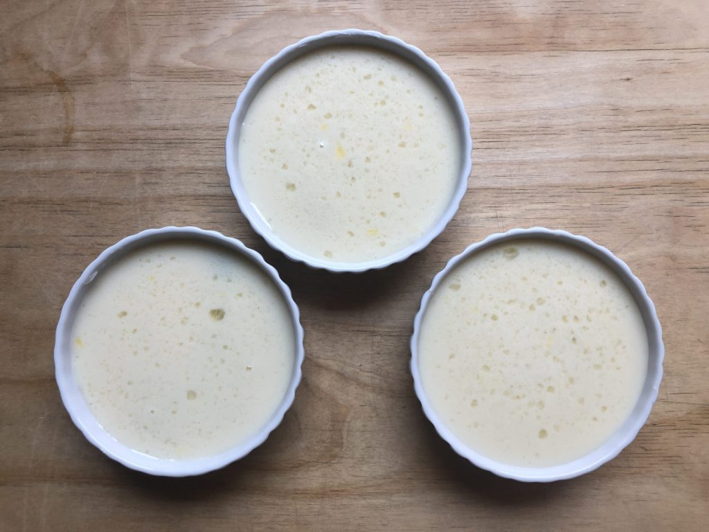 • Verser le mélange dans trois petits ramequins individuels de 10 cm de diamètre préalablement beurrés.