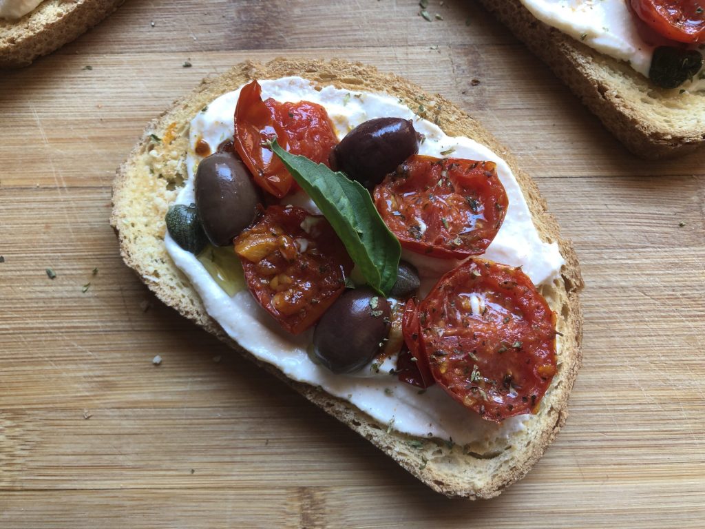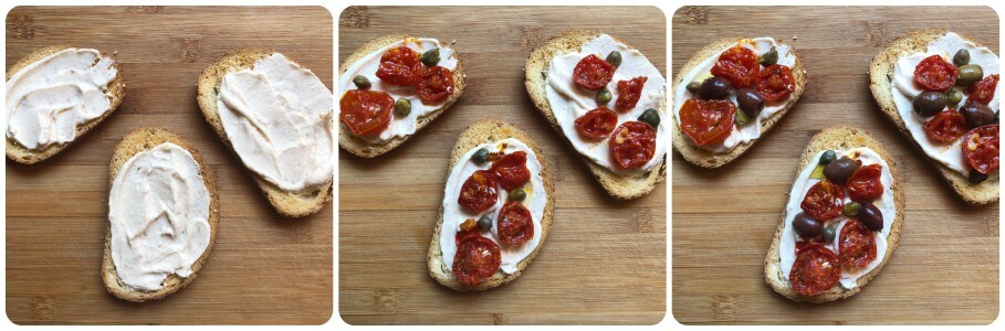 • Étaler un peu de crème de fromage sur chaque tranche et y disposer quelques tomates cerises, quelques câpres préalablement rincées et séchées, et quelques olives taggiasche.