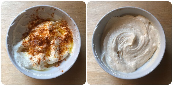 • Dans une petite assiette, mélanger le fromage frais avec une demi-cuillère à café de paprika fort, une pincée de sel et un filet d’huile.