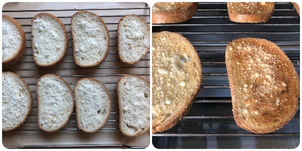 • Disposer les tranches de pain de campagne sur la grille du four, les saupoudrer de fromage râpé et les passer sous le gril jusqu’à ce qu’elles soient dorées et croustillantes (cela prendra environ 5/6 minutes).