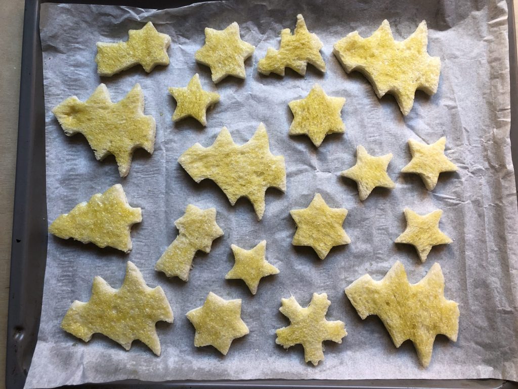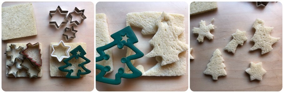 Découpez les tranches de pain pour tramezzini en utilisant des emporte-pièces à biscuits sur le thème de Noël. Pour réduire au minimum les chutes, utilisez des petites étoiles de différentes tailles, même les petites conviennent parfaitement.