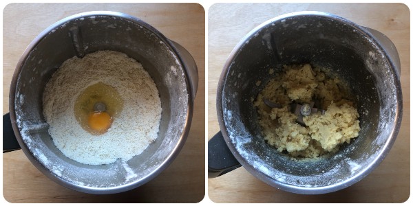 • Il est temps d’ajouter aussi l’œuf et de pétrir (20 sec. vit. 5). Vous obtiendrez une pâte sablée assez molle. Si elle colle aux doigts, ajoutez encore quelques grammes de farine blanche. Si elle est trop sèche, ajoutez une cuillère à soupe de lait froid. Dans les deux cas, travaillez encore 5 secondes toujours à la vitesse 5.