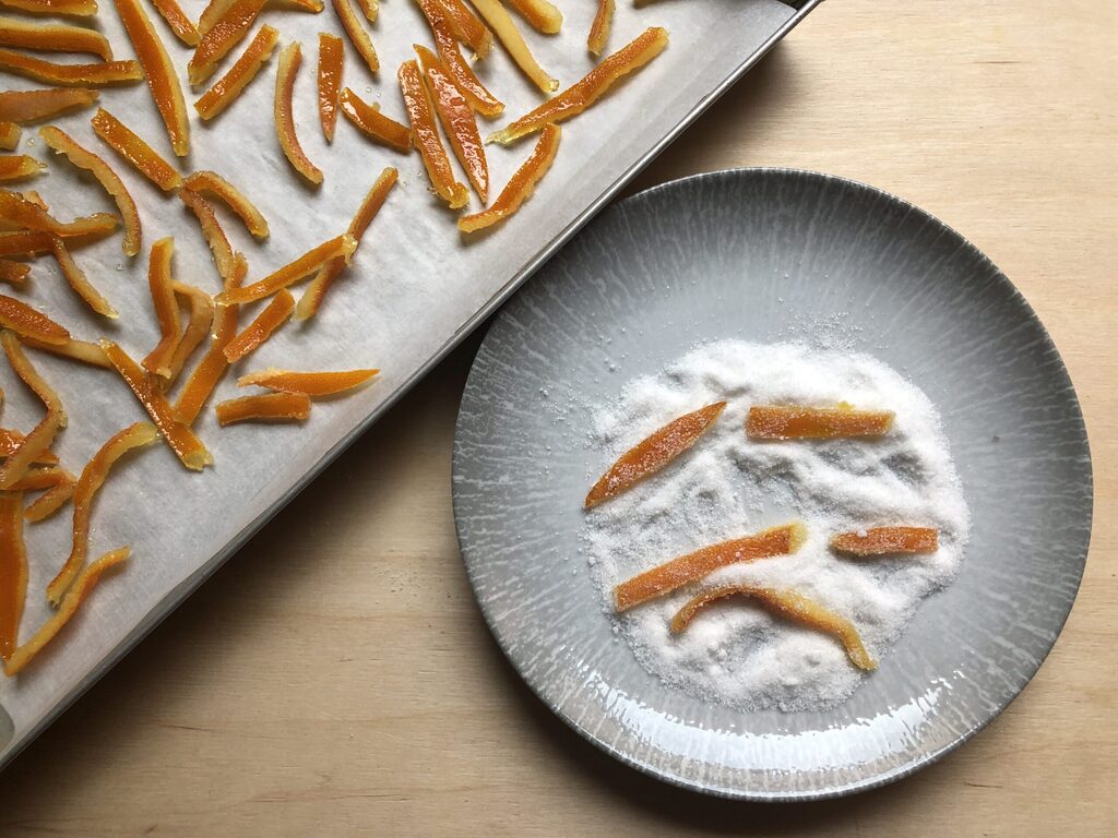 Éteindre le feu et transférer les écorces d’orange sur une plaque (ou un plateau) recouverte de papier cuisson en les espaçant pour éviter qu’elles ne collent.