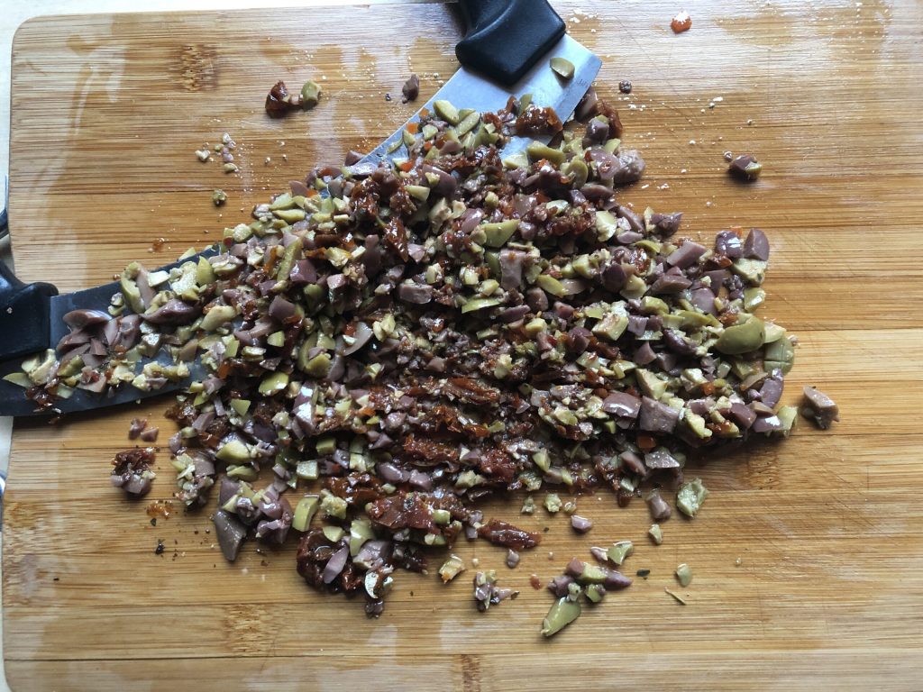 Hacher grossièrement les olives vertes et noires avec les tomates séchées. J’ai utilisé un mélange d’olives à l’huile que j’avais à la maison mais celles en saumure fonctionnent aussi très bien.