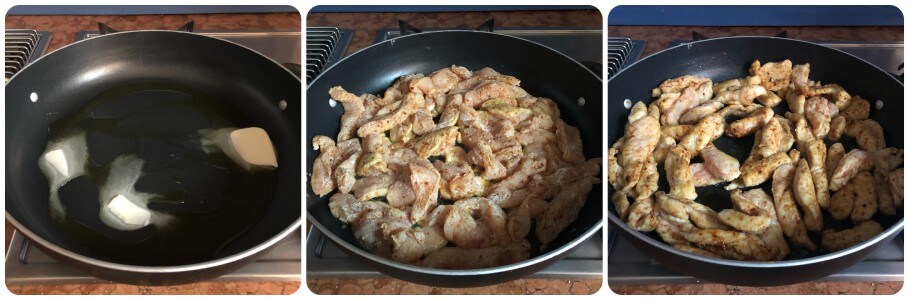 Dans une grande poêle, faire fondre le beurre avec quelques cuillères d’huile, puis ajouter les émincés de poulet et les faire dorer rapidement.