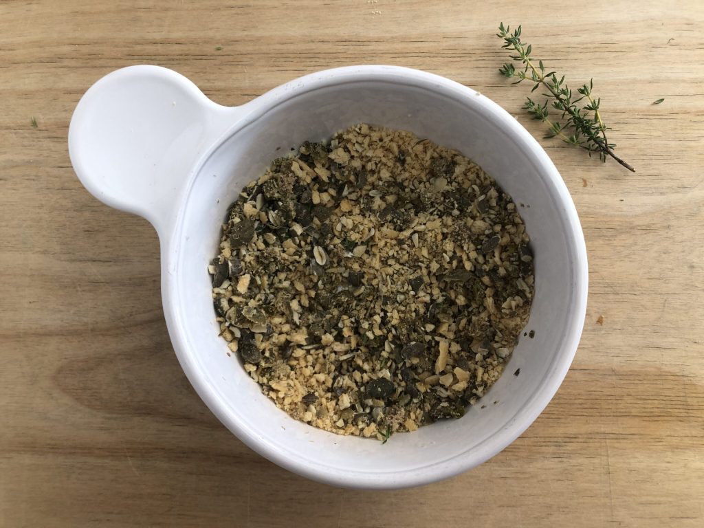 Dessaler les câpres sous l’eau courante, bien les tamponner avec du papier absorbant, puis les hacher avec un hachoir avec les graines de courge.