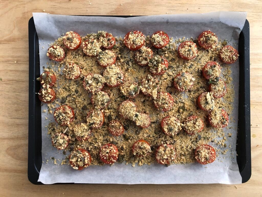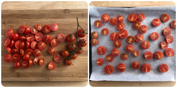 Laver les tomates cerises, les sécher, les couper en deux et les disposer dans un plat recouvert de papier sulfurisé, côté coupé vers le haut. Saler et poivrer à volonté.