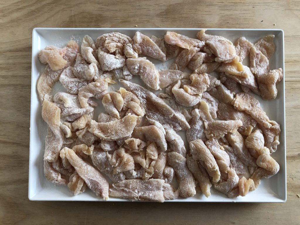 Couper les tranches de blanc de poulet en lanières et les passer dans la farine.