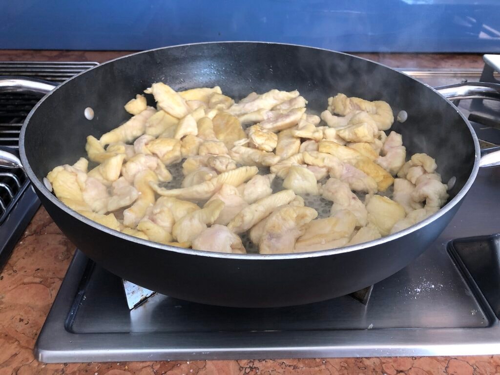 Dans une grande poêle, chauffer quelques cuillères d’huile et y faire revenir une gousse d’ail pelée et coupée en deux. Lorsqu’elle commence à crépiter, ajouter les émincés de poulet et les faire bien revenir des deux côtés, en les mélangeant souvent.