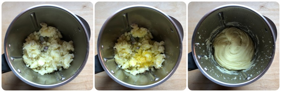 • Égouttez-les (gardez un peu d’eau de cuisson) et écrasez-les immédiatement pendant qu’elles sont encore chaudes. En les écrasant maintenant, on évite que le mixeur les rende collantes.