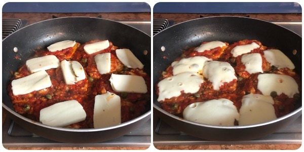 Placez une tranche de mozzarella sur chaque escalope, baissez le feu, mettez le couvercle et faites cuire jusqu’à ce que le fromage soit fondu.