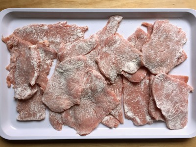 Couper les tranches d’escalope de veau en morceaux pas trop petits et les fariner.